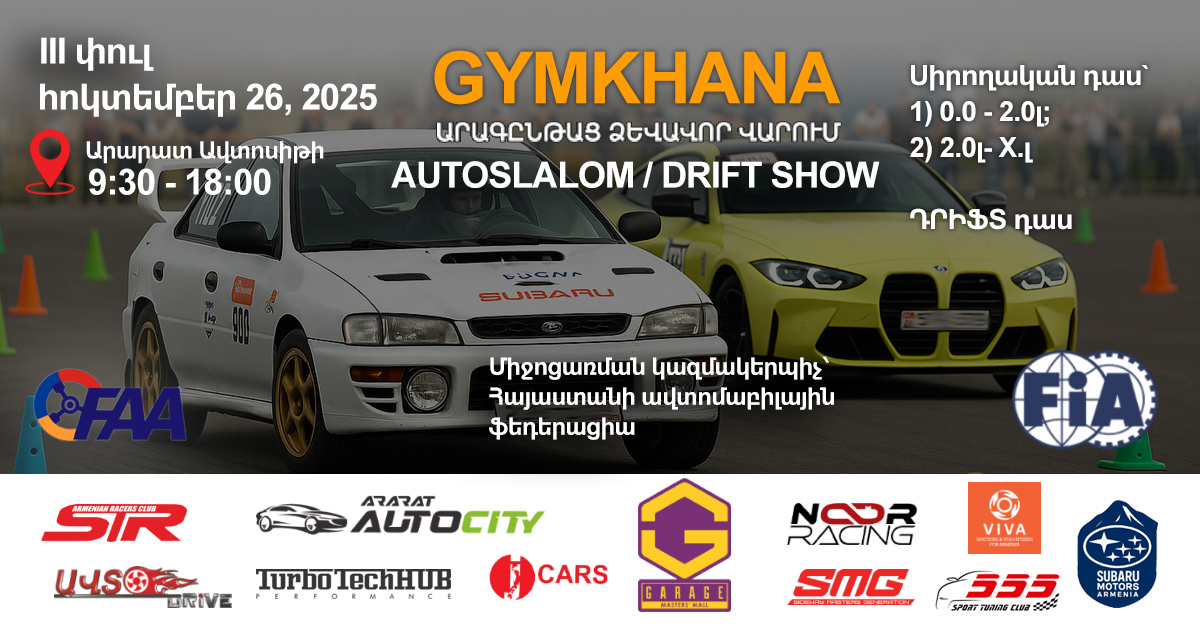 Հոկտեմբերի 26-ին հրավիրում ենք մասնակցելու ԱՐԱԳԸՆԹԱՑ ՁԵՎԱՎՈՐ ՎԱՐՄԱՆ (GYMKHANA/Скоростное фигурное вождение) դիտարժան և հետաքրքրաշարժ միջոցառման lII-րդ փուլին։